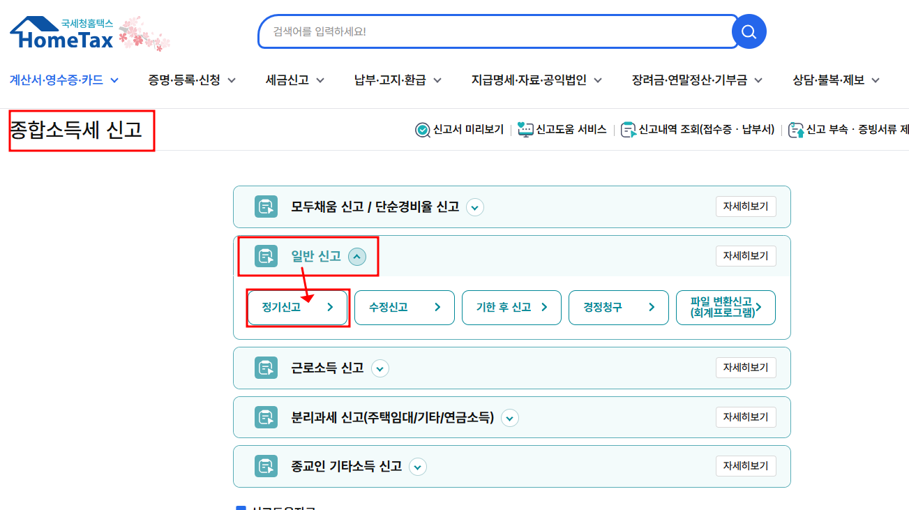 - '세금신고' 메뉴에서 '종합소득세' 선택