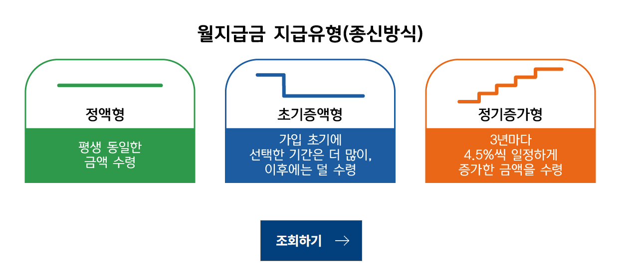 - 정기증가형: 최초 월 지급금은 적게 시작하지만, 매 3년마다 4.5%씩 증가하는 방식입니다.